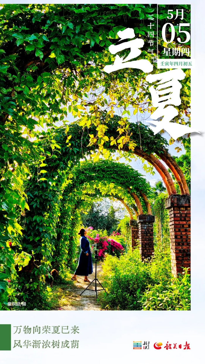 据@韶关天气,预计未来一周韶关前期以晴好天气为主,早晚气温低,昼夜温差大;后期云量增多,转雷雨天气。早晚气温较低,注意适时增减衣物;天气较干燥,需注意野外和家居用火安全。今天是节后第一个工作日,同时也迎来了立夏节气。立夏有三侯:一候蝼蝈鸣、二候蚯蚓出、三候王瓜生。立夏时节,天气趋于炎热,大家要保持平心静气、心情愉悦。