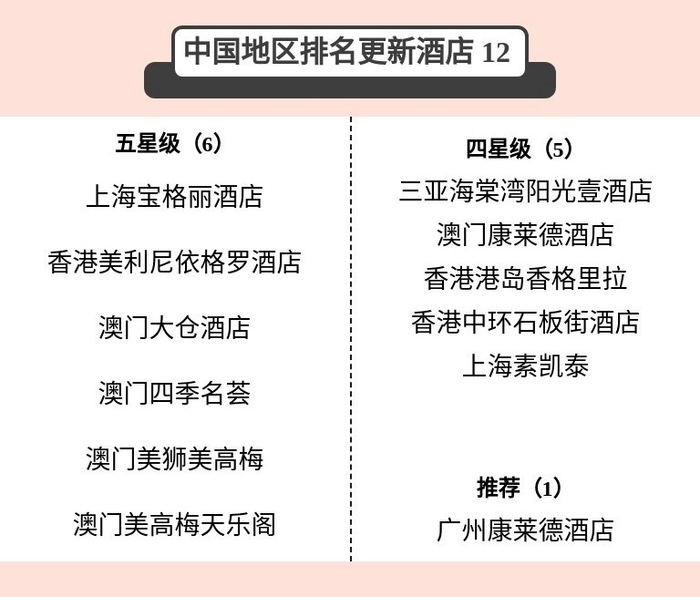 此外,有12家中国地区酒店的上榜排名更新晋升,包括6家五星酒店、5家四星酒店和1家推荐酒店,涵盖宝格丽、尼依格罗、美高梅、康莱德、香格里拉等酒店品牌。