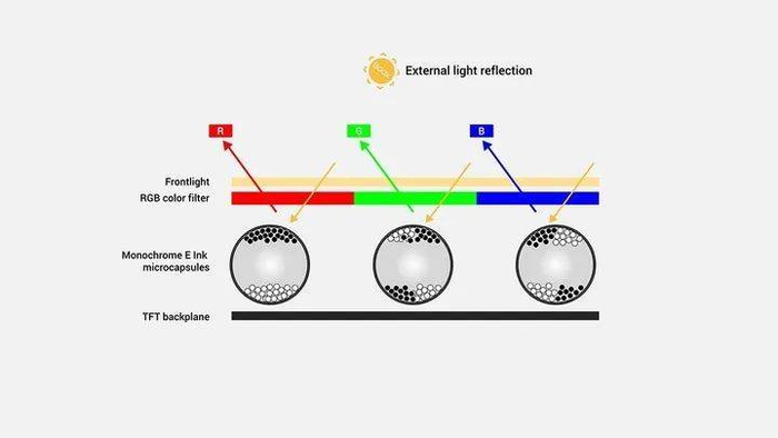 要让墨水屏显示出颜色,目前有两种主流的方法:一是在显示屏内加入一层彩色的滤光层,当外部光线进入墨水屏再反射出来时,就能显示出特定的颜色。