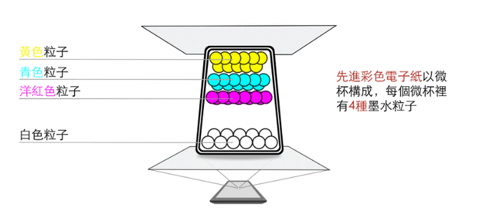 每颗微囊内部有种不同颜色的色素颗粒,通过上下施加不同的电压让颗粒的排列发生变化,从而显示特定的内容。