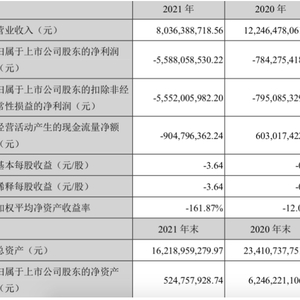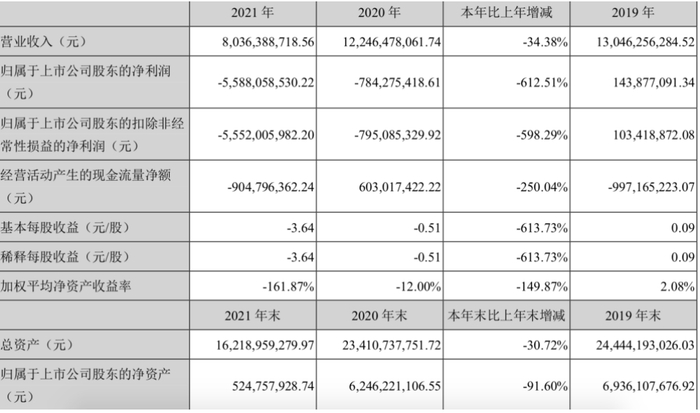 广田集团2021年实现营业收入80.36亿元,同比下滑34.38%;归属于上市公司股东的净利润为-55.88亿元,同比暴跌612.51%;归属上市公司股东的扣非净利润为-55.52亿元,同比暴跌598.29%。