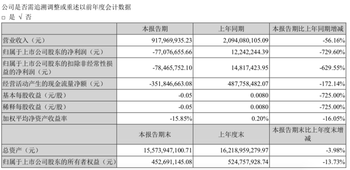 2021年跌入“谷底”的情况下,2022年一季度,其业绩仍没有改善的痕迹,不仅亏损延续,且跌幅再度扩大,多个核心业绩数据同比跌幅甚至超过700%。其中营业收入为9.18亿元,同比下滑56.16%;归属上市公司股东净亏损7707.67万元,同比暴跌729.6%。