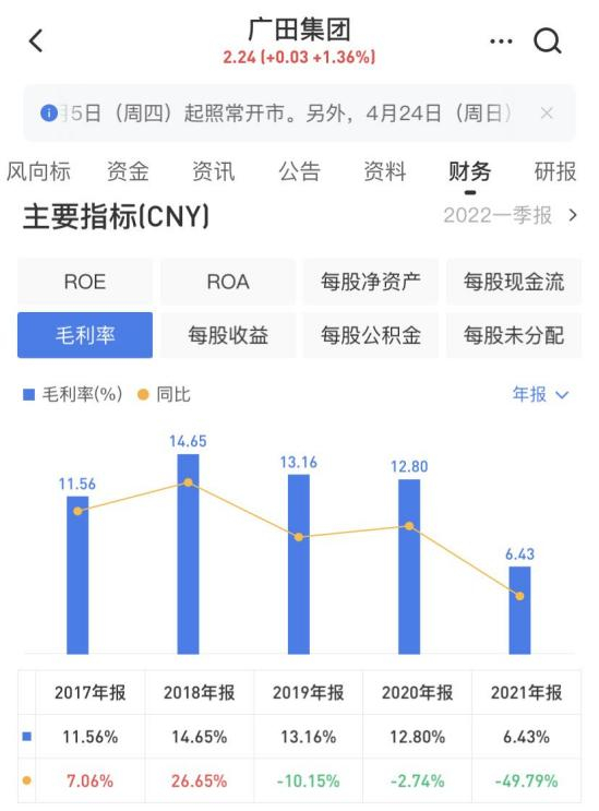 虽然广田集团的营业收入和净利润双双大跌,净利润跌幅是营业收入跌幅的近18倍,这与广田集团2021年创下历史新低的毛利率有重要关系。