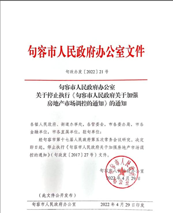 4月29日,句容市政府办公室发文称,经句容市第十七届人民政府第五次常务会议研究,决定即日起停止执行《句容市人民政府关于加强房地产市场调控的通知》(句政发〔2017〕27号)的文件。