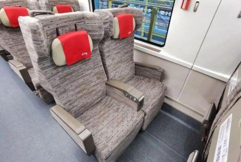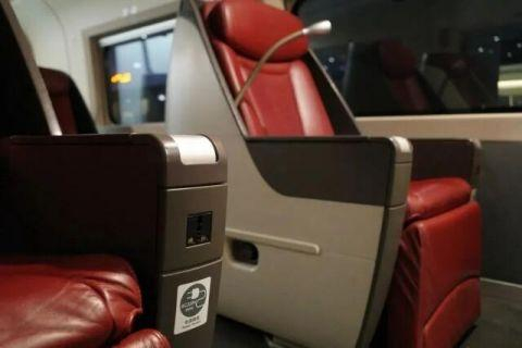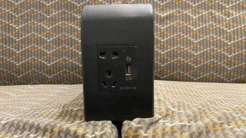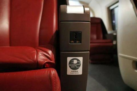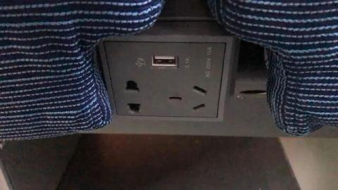 一等座席充电接口位于座椅扶手中间,有插孔和USB两种方式。