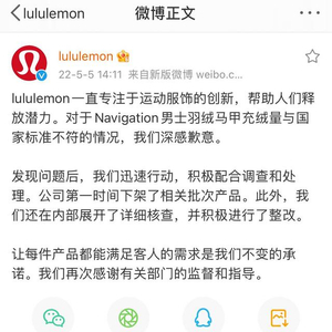 新京报贝壳财经讯(记者王真真)5月5日,针对产品以次充好被罚事件,加拿大瑜伽裤品牌lululemon(露露乐蒙)通过微博账号回应称,对于Navigation男士羽绒马甲充绒量与国家标准不符的情况,我们深感歉意。公司第一时间下架了相关批次产品,在内部展开详细核查,并积极进行了整改。