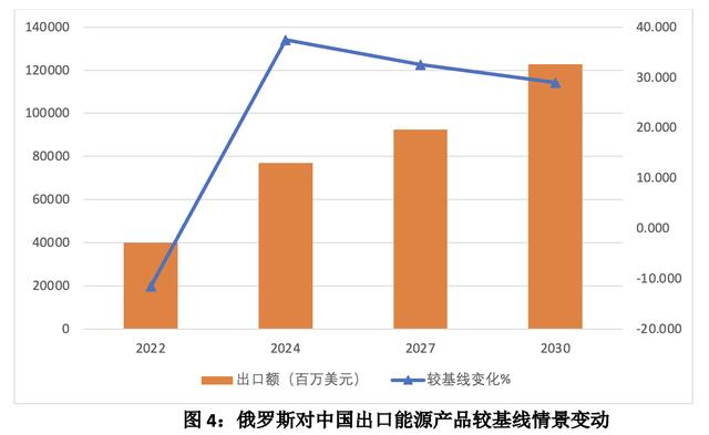 在对俄经济制裁背景下,俄罗斯与其他非西方国家的贸易联系加强,中国将是俄主要的贸易转移对象,2022年俄对中国进、出口额较基准情景分别上涨1106亿(78%)、1432亿美元(46.8%)。对俄贸易制裁短期内对中国的进出口贸易带来负面冲击,2022年中国进出口均较基线情景有所下降,但长期来看将会对中国出口带来正面溢出效应。俄罗斯与中国在能源、制造业和农业方面的贸易联系将加强。在欧盟与俄的能源贸易受阻情况下,2022年后俄对中国的能源出口较基线情景增长幅度超过30%。而俄从中国进口也将大幅上涨,主要集中在核心制造业产品,俄对中国制造业供应链的依赖将加强。