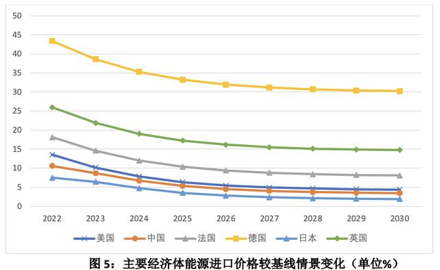 对俄实施经济制裁将推高能源价格。主要经济体能源进口价格大幅变动,其中对俄能源高度依赖的德国2022年进口能源价格较基线上浮43.4%,中国的涨幅也达10.6%。中长期来看,随着中国能源进口量增加,进口价格涨幅将逐渐趋于平缓。