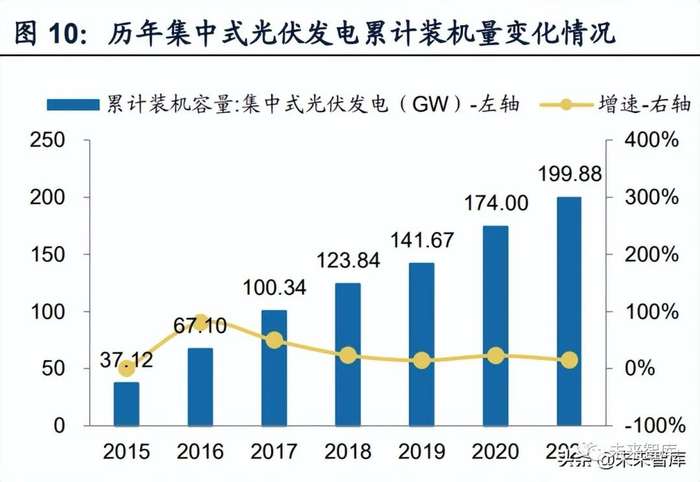 集中式光伏发电一直是我国光伏发电主要组成部分,2021年累计装机容量达到 199GW,近年在累计光伏发电装机容量中来占比持续稳定在65%-70%,2021年新 增装机容量被分布式光伏发电超越,未来集中式光伏发电增长势头将进一步减弱。