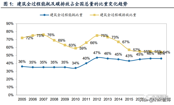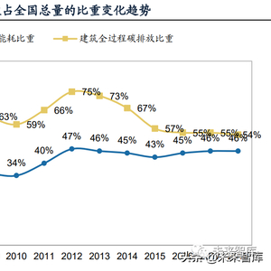 建筑行业全过程碳排放高企,减排空间较大。2018年全国建筑全过程碳排放总量为49.3亿吨,占全国碳排放比重的51.3%。其中 建材生产阶段碳排放为27.2亿吨,占全国碳排放比重的28.3%,占建筑全过程排放总 量的55.21%;建筑施工阶段碳排放为1亿吨,占全国碳排放比重的1%,占建筑全过程排放总量的1.93%;其中较易实现碳减排的建筑运行阶段碳排放为21.12亿吨,占 全国碳排放比重21.9%,占建筑全过程排放总量的42.87%。建筑业减排空间较大。鉴于中国制造业体量较大,世界对中国制造业的高需求持续存在,短期内难以实现 有效的绿色减碳,而较为灵活、实现阻力更小的建筑减碳领域得到了更多关注。
