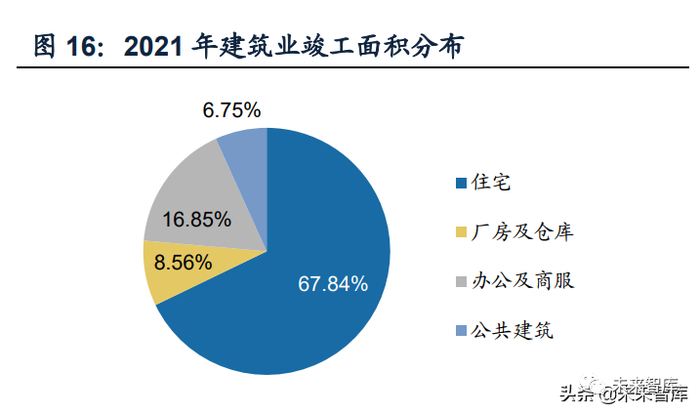 根据国家统计局数据,2021年建筑业竣工面积合计约为38.89亿平方米,为统一口径 方便分析,其中主要几项可以合并为:住宅建筑/厂房及仓库建筑/办公及商服建筑/公 共建筑 / 分别约为 27.06/3.41/6.72/2.69 亿平方米,占比分别约为 67.84%/8.56%/16.85%/6.75%。根据往年竣工面积占比数据,不同建筑类型竣工面 积占比基本维持稳定,可以合理预测未来五年占比情况与2021年保持一致。根据国 家统计局公布的建筑业竣工面积合计值,历年来该项增速逐渐走低至维持较低水平, 2021年以后由于疫情情况稳定加之政策利好,基建增速预期估计回升为4%并继续保 持稳定。