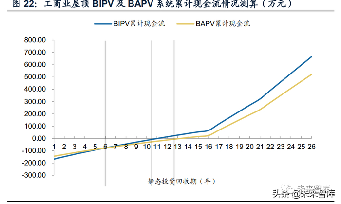 通过搭建模型进行简单测算可以得出,基于之前假设下工商业屋顶BIPV系统的静态 投资回收期约10.0年,项目IRR约12.3%,工商业屋顶BAPV系统的静态投资回收期 约12.3年,项目IRR约11.1%。综合来看,BIPV系统具备更好的经济性与投资回报。分析二者项目年限内累计现金 流情况可看到,尽管BAPV系统在初始投资方面具有略微优势,但现金流整体增速不 及BIPV系统,运行6-7年后会被BIPV超越,达到投资回收期时间也比BIPV系统更长, 后期二者收益差距进一步拉大。