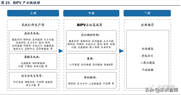 就上游光伏组件部分来看,其上游与光伏行业产业链存在一些重合部分。这一阶段 的关键环节主要是光伏电池生产商,相关光伏电池企业可直接转进BIPV产业获得新 的利润增长点,如隆基股份、特斯拉、晶科能源等。