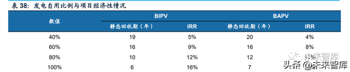 收益端方面,发电自用比例提高有利于项目经济性改善。原测算中选取80%发电自 用比例。若假设业主将发电量全部消纳,项目经济性会进一步提高。若假如项目部 分或全部发电量上网出售,由于上网电价产生效益要低于自发自用电价节省数额, 相应的系统经济性将略降低,但同等自用比例情况下BIPV系统与BAPV系统的项目 IRR差别不会很大。总体而言,发电自用是未来BIPV系统重要趋势。