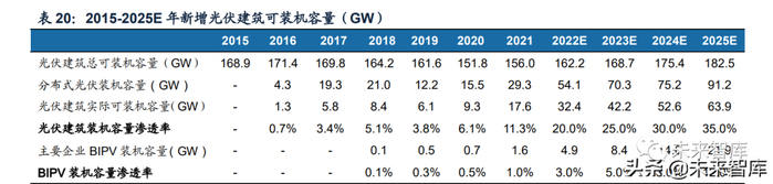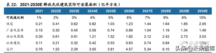 存量市场空间方面,预计 2022-2025年释放出的存量光伏建筑市场分别为 994/1418/1819/2001亿元。其中BIPV对应的市场空间分别为20/43/73/100亿元。以2021年为节点,假定自2015年至2021年总计新增竣工的面积作为光伏建筑改造的 存量基础,同上计算逻辑可得实际可装机面积。由于存量建筑的改造无法一蹴而就, 假设这些存量装机面积每年释放1%用于改造,则改造比例逐渐增加至2030年的10%, 可得存量光伏建筑实际可安装面积随时间改变的变化情况,进而得到释放出的存量 光伏建筑可装机容量情况。假设存量建筑改造的BIPV装机效果增速较低,基于此预 测可推得BIPV存量市场空间。
