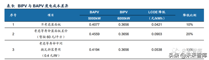 BIPV相较于BAPV成本构成有一定变化。支架方面。根据《森特股份BIPV解决方案》 中提出的模块,BIPV项目相较于BAPV项目建材属性更强,无需一系列屋顶加固等 额外光伏支架安装工作,支架部分功能已被结构胶直接取代。因此BIPV项目支架费 用假设可减半取0.18元/W。整体屋面方面。与传统的BAPV系统相比,BIPV系统整 体性提升,防水性提升,屋面使用寿命提高,使得屋面成本增加,其中彩钢瓦部分, 根据现有高端彩钢瓦价格行情,预估此处增加0.2元/W成本,其次檩条等构件方面, 预估增加成本0.2元/W。施工及其他费用方面,由于BIPV系统具有较高施工难度及 设计难度,具有一定行业壁垒,施工利润较高,此处相较于BAPV项目也有一定提升。