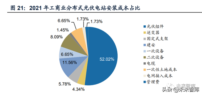 工商业屋顶分布式光伏系统初始投资成本构成:根据中国光伏行业协会《中国光伏产业发展路线图2021版》公开数据,我国分布式 光伏电站光伏系统端成本主要由光伏组件、逆变器、固定式支架、一二次设备、电 缆、土地成本、电网接入成本等费用构成,建筑工程端成本主要由建安、一次性土地 费用、管理费等组成。可以看到影响分布式光伏电站成本的主要方面是光伏组件、 逆变器、支架等系统组件费用,以及弹性较大的建安费用、管理费用、施工利润等。