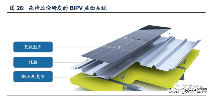 3.由传统建筑企业往BIPV业务延伸:主要由建筑钢 结构、幕墙、工程三类企业组成,代表如森特股份、东南网架、江河集团、杭萧钢构、 龙元建设等。其中森特股份原为国内高端金属围护行业龙头,有丰富的相关施工经验及资源储备,2021年由隆基股份入股成为其第二大股东,共同开拓光伏建筑一体化新领域,有助于构筑产品技术壁垒,有望打通上游材料成本与下游需求环节。