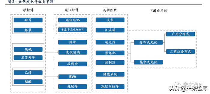 光伏发电的产业链上游主要为光伏电池相关原材料组成,包括形成电池的单晶硅和 多晶硅;中游主要为电池片、电池组件生产企业和系统集成企业;下游为光伏发电 应用领域,包括分布式光伏发电和集中式电站。