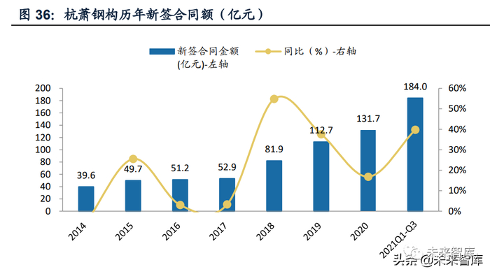 深耕钢结构主业,营收稳步增长:作为国内首家钢结构上市公司,公司剥离房地产 业务,深耕钢结构传统业务。钢结构产量方面,公司钢结构产量稳步增长,2018年 -2020年钢结构产量分别同比增长26%/16%/22%,2020年达到68.53万吨,年均复合 增长率8.94%。新签合同额方面,公司2021年前三季度累计新签合同额99.5亿元,同 比增长18.39%,其中钢结构制造与安装新签订单总额达67.81亿元,占比68.16%。分业务类型看,其中钢结构制造与安装67.8亿元,同比增长2.72%,占比68%,营收 方面,公司前三季度营收67.4亿元,同比增长32%,营收稳步增长。公司承接了亚运 会动员村、长沙国际会议中心等一批重大项目,预计未来公司钢结构产量及新签订 单量将继续保持稳定增长。