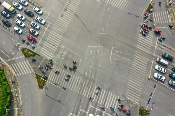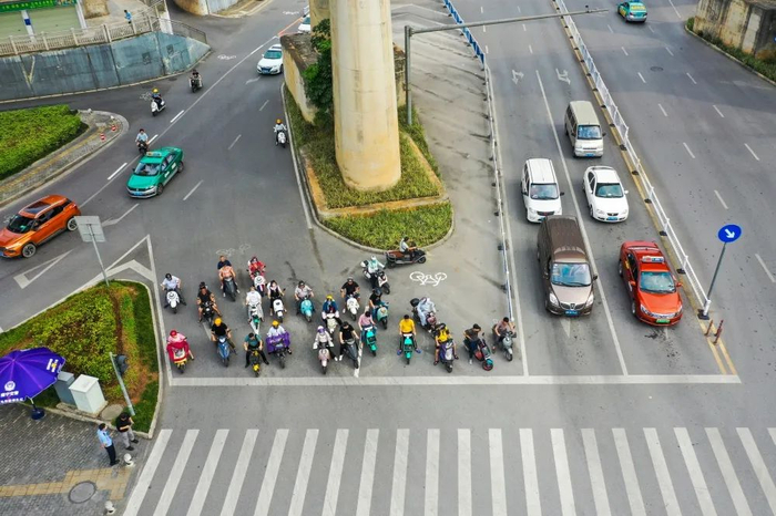 ▲改造后,交警部门在该路口清除了原有地面标线及导流线,重新规划非机动车左转及直行待行区,规范路口非机动车停车等待区域。