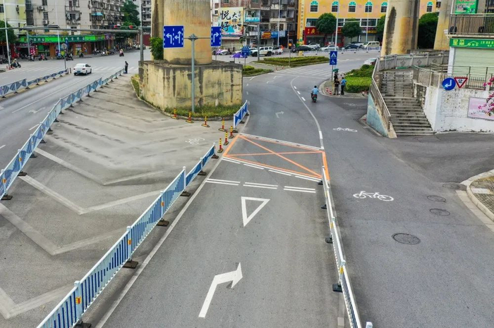 ▲改造后,交警部门在园湖北路路段的桥墩下施划了左右两条非机动车专用道分流汇入等待区域,及时分流左转弯非机动车对右转弯通道的阻挡,同时增加机非隔离护栏,分流入口处增加非机动车弹性柱,并完善非机动车地面引导标识,实现控制车辆汇流、分流或穿越的位置,尽量缩短机动车和非机动车通过的距离和时间。