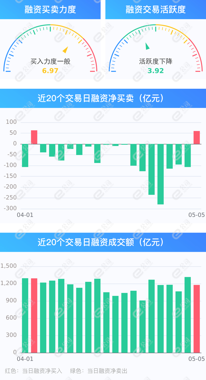 两市融资余额增加59.88亿元,融资客交易活跃度下降,中止连续17日净卖出 证券时报e公司 证券时报·e公司APP官方账号 2022.05.0608:43 关注 e公司讯,截至5月5日,上交所融资余额报7703.59亿元,较前一交易日增加19.74亿元;深交所融资余额报6693.97亿元,较前一交易日增加40.15亿元;两市合计14397.55亿元,较前一交易日增加59.88亿元,融资交易额1176.65亿元,占A股成交额13.14%,其中融资买入额618.26亿元,融资偿还额558.38亿元,交易活跃度下降10.45%。统计发现,融资客中止连续17日净卖出。