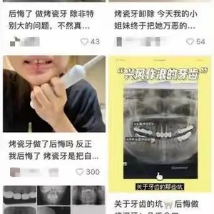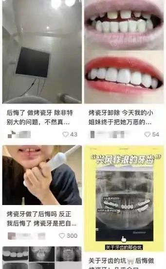 提到烤瓷牙,王爱琳最强烈的情绪就是“后悔”,而和她一样后悔做烤瓷牙的人为数众多。在社交媒体上,不少人发后悔贴,奉劝网友“真的别做”。