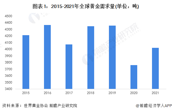 从全球黄金消费需求来看,全球黄金消费数量呈现波动变化,整体在4000吨左右浮动。2020年受疫情影响,全年全球黄金消费需求出现大幅下降至3759.6吨,为近几年最低值。2021年则有所回暖,全球黄金消费量4021吨。