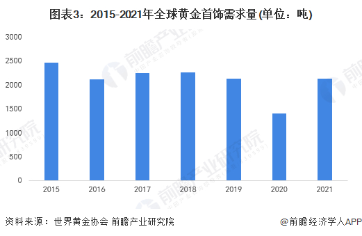 从全球黄金首饰消费需求来看,全球黄金消费数量呈现波动变化,整体在2000吨左右浮动。2020年受疫情影响,全年全球黄金首饰消费需求出现大幅下降至1401.1吨,为近几年最低值。2021年则有所回暖。