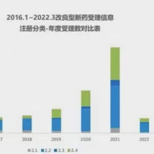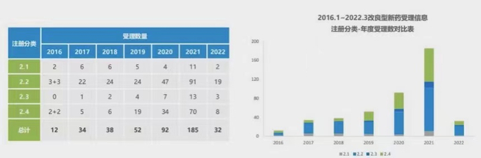 数据显示,自2016年1月至2022年3月的近5年时间里,化药2类改良型新药的注册受理呈现递增趋势,其中2021年显著增加,为2020年总量的2倍。