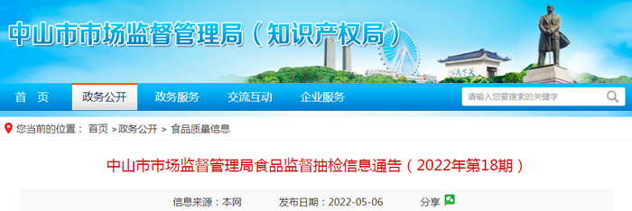 中国质量新闻网讯 2022年5月6日,广东省中山市市场监督管理局网站发布食品监督抽检信息通告(2022年第18期)。