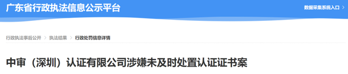 案件名称:中审(深圳)认证有限公司涉嫌未及时处置认证证书案