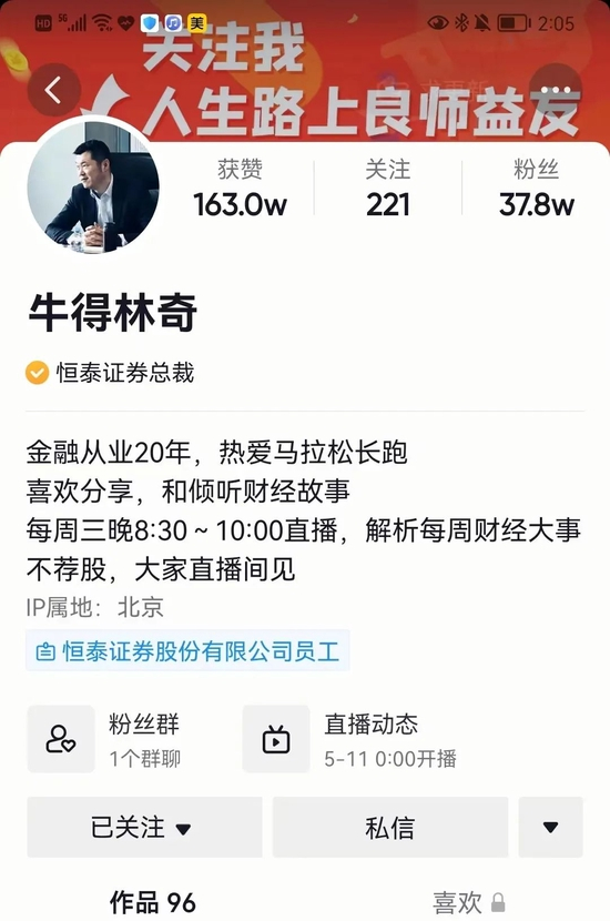 依照爆料线索,行家在抖音中找到了“牛得林奇”。这一标注为“恒泰证券总裁”的账号,有如下介绍: