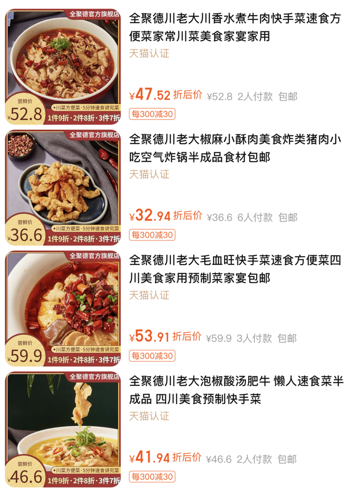 小编看到,“川老大”预制菜已经登陆了全聚德集团微信商城、全聚德天猫和京东旗舰店,以及四川饭店的线上外卖平台。据四川饭店的一名店员透露,五一期间不能堂食,饭店就在门口摆上预制菜产品售卖。