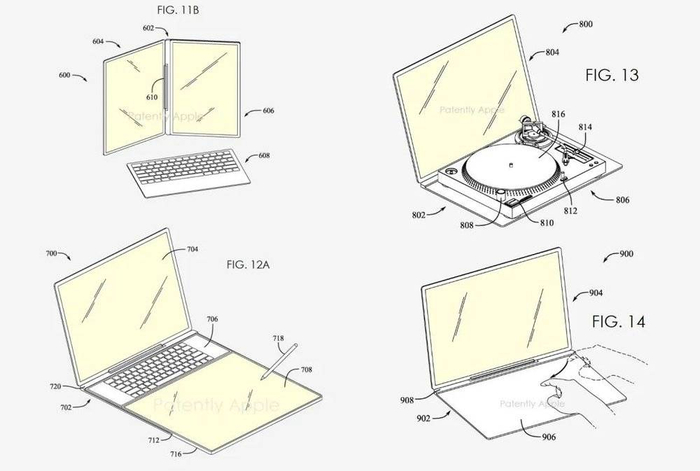 苹果早些时候还申请了一项名为“高度模块化的计算与输入设备”的专利,展示了全触屏 Mac、各种形态的双屏 MacBook,还可以接上一个唱机——下雨天,MacBook 和黑胶更配?