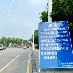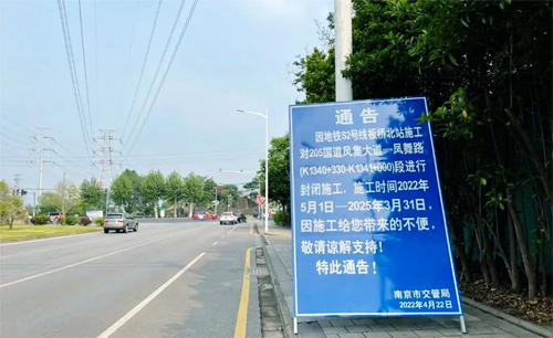 根据南京市交管局路牌通告,因地铁S2号线板桥北站施工,对205国道凤集大道-凤舞路段进行封闭施工,施工时间2022年5月1日-2025年3月3月31日。