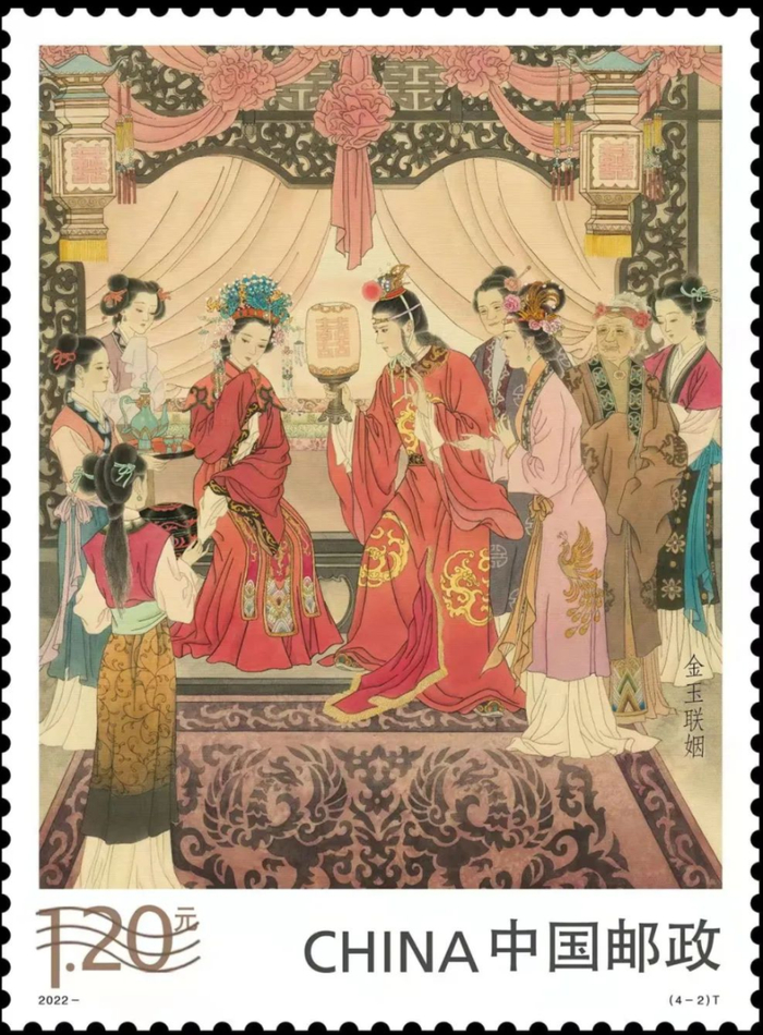 此次发行的《红楼梦(五)》特种邮票一套4枚,分别是黛玉焚稿、金玉联姻、探春远嫁、宝玉却尘。