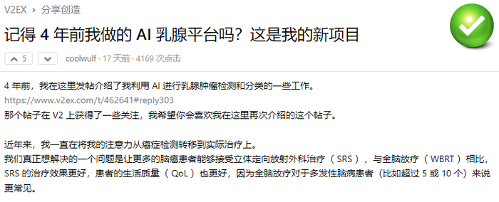 这个免费的 AI 检测乳腺癌网站,coolwulf 前后大概花了三个月的业余时间,忙得时候直接睡在办公室,最后终于在 2018 年上线。