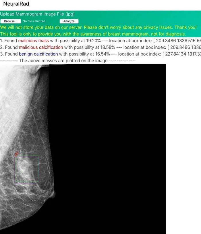 用户只要上传自己的 X 光影像图片,就能让 AI 为自己快速诊断乳腺癌病情,肿瘤识别的准确率,也已经达到 90%。