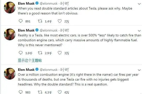“每年有超过100万台汽油车汽车发生火灾,导致数千人死亡,但没有一场像特斯拉汽车起火一样成为头条,为什么要搞双重标准?这是个问题。”