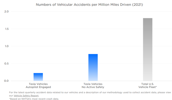 特斯拉表示,激活Autopilot(包括自动辅助驾驶和主动安全功能)的情况下,每454万英里(726万公里)有一起事故被记录下来。