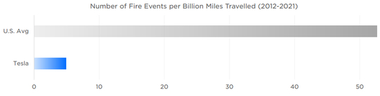 不过特斯拉在报告中拿出数据证明,尽管不能完全避免起火事故,但与全美所有汽车综合数据相比,特斯拉每10亿英里起火事故率整整低11倍: