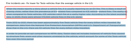 另外油车拥趸们诟病电车起火问题,特斯拉还拿出数据证明自家产品的起火概率,比传统汽车低11倍: