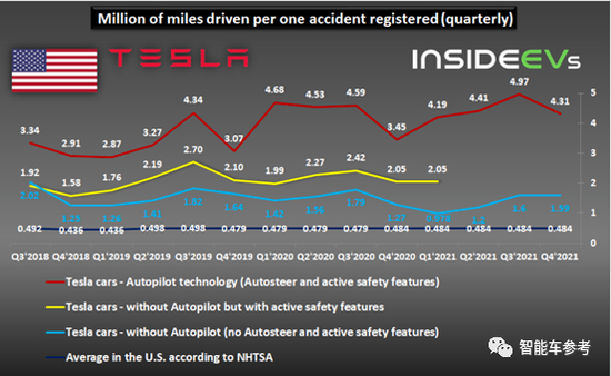 所有数据都来自特斯拉官方统计,数据含义是每XX英里报告一起事故,所以在y轴方向当然是点位越高表现越好。