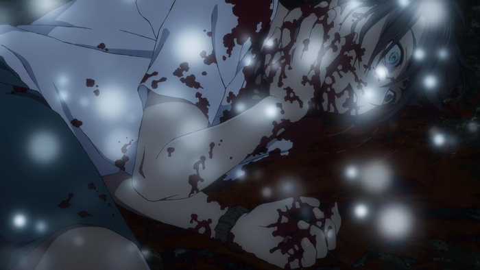 比如第二集慎平在暗中观察影子澪杀害凸村,并复制出凸村影子人后,被发现灭口的段落。漫画中是影子澪一把匕首直冲慎平插上脖子,这个暴力感拉满的画面的确看得人窒息到下意识想要摸自己的脖子,而动画的处理则是完全从主观视角出发,怼上一张惊恐的大脸,放大的瞳孔,颤抖的双手摔落手机,紧接着人物倒地捂着脖子喷血,用一系列的特写蒙太奇完成了对血腥杀戮的描摹,在观看时也更具身临其境的那种刺激感。