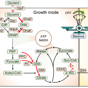 中国科学院天津工业生物技术研究所研究员刘君带领的微生物生理和代谢工程研究组以低价值甘油为原料,通过途径工程和动态代谢控制,开发了高效生产GABA谷氨酸棒杆菌细胞工厂。该研究首先利用随机RBS工程技术在谷氨酸棒杆菌中构建并优化了甘油利用途径,实现了甘油的高效同化利用。随后在该菌株中重建GABA合成途径,构建GABA合成细胞工厂,实现了甘油向GABA的生物转化。在GABA合成过程中需要TCA循环中间产物α-酮戊二酸为底物,而将过量的α-酮戊二酸代谢流导向GABA合成途径必然引起TCA循环通量降低,从而造成代谢失衡和生长阻滞,因此,如何平衡产物合成和细胞生长的关系是提升GABA生物合成的关键限制因素。该研究随后在谷氨酸棒杆菌中开发了一种可调的生长期依赖性自主双功能遗传开关(GABS),能够根据细胞生长时期自动关闭或开启基因的表达,从而实现了细胞内基因的动态表达调控。利用该调控技术重构了GABA合成代谢网络,工程菌株能够在积累足量的生物量之后发生代谢状态转变,使细胞代谢状态由“生长模式”向“生产模式”转变,从而实现了细胞生长和产物合成的协同平衡。最终构建的工程菌株GABA产量超过45 g/L,产率提升至0.4 g/g 甘油,是目前报道的利用甘油生产GABA的最高产量,对谷氨酸棒杆菌细胞工厂的代谢调控提供了新的工具和方法。