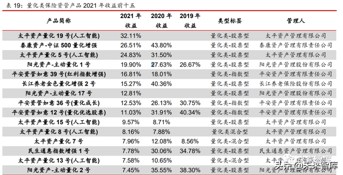 从 Wind 共获取到的 28 只量化类保险资管产品样本中有 23 只在 2021 年录得正收益,有 27 只在 2021 年跑赢沪深 300 指数。其中太平资产量化 19 号(人工智能) 2021 年收益率最高 为 32.11%,其次是泰康资产-中证 500 量化增强收益率 26.51%、太平资产量化 5 号(人工智 能)收益率 24.83%。