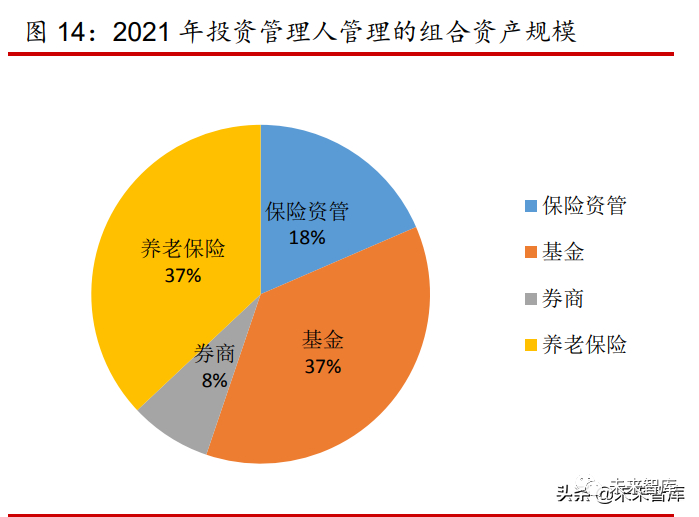 2021 年各类投资管理人所管理的组合资产规模占比结构与 2020 年基本一致,但组合资 产规模总额同比增加 18.08%。其中养老保险公司管理的组合资产规模占总规模的 37%、基 金公司管理的组合资产规模占总规模的 37%。此外,保险资管机构作为投资管理人的组合资 产规模为 4740.48 亿元,占全部投资管理人所管理的组合资产规模的 18.51%,相比 2020 年 占比 17.94%有所提高。