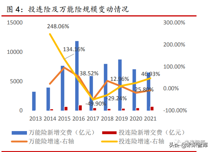 2021 年投连险新增交费规模相比 2020 年增加 46.93%,全年投连险独立账户新增交费 为 695 亿元;万能险保费收入 2021 年同比下降,全年新增交费为 6479 亿元,相比 2020 年 新增交费 7044 亿元,降幅达 8.02%。